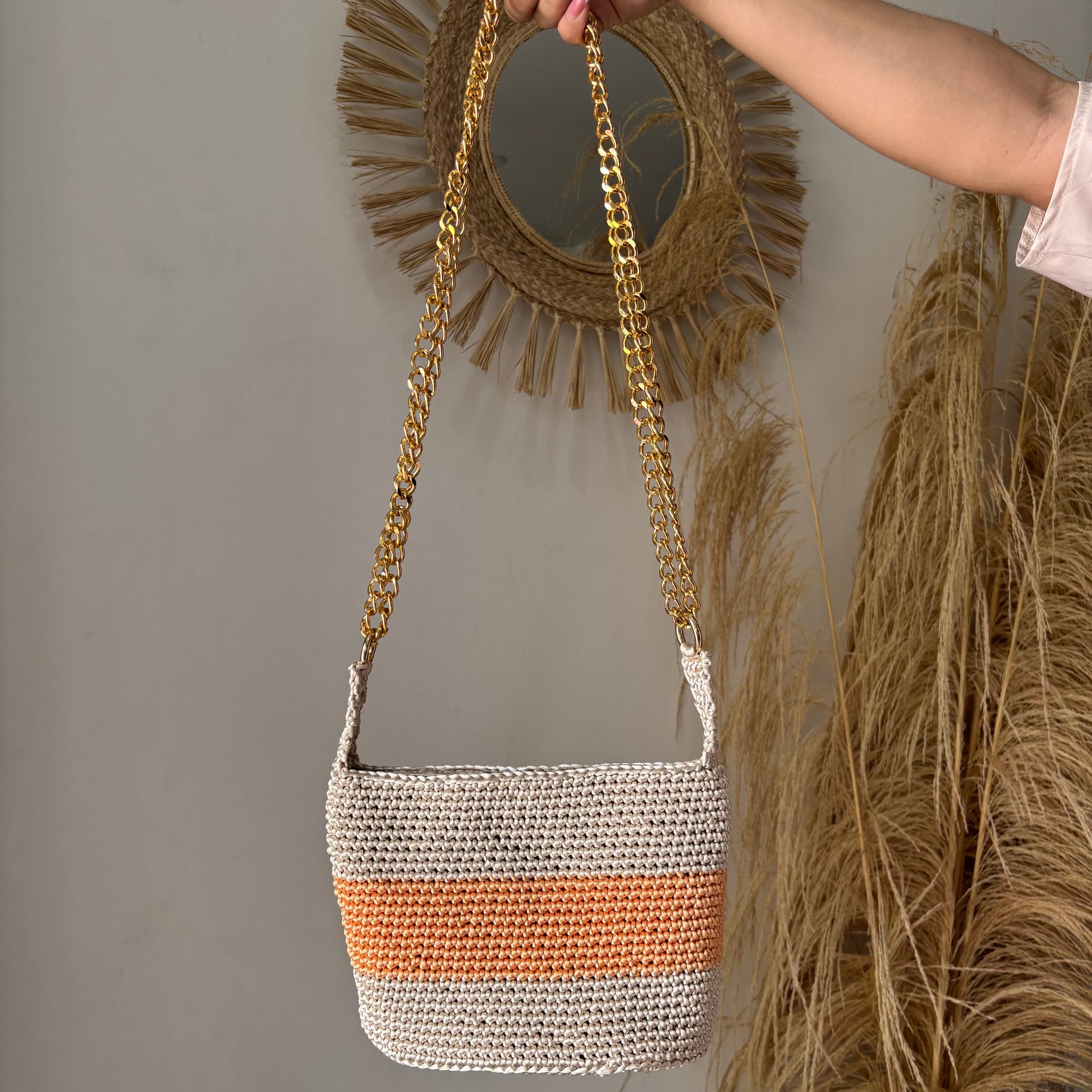 Una cartera hecha a mano con hilo de seda y una cadena de muy buena calidad en color dorado. Una pieza única que representa la fusión perfecta de tradición y modernidad.