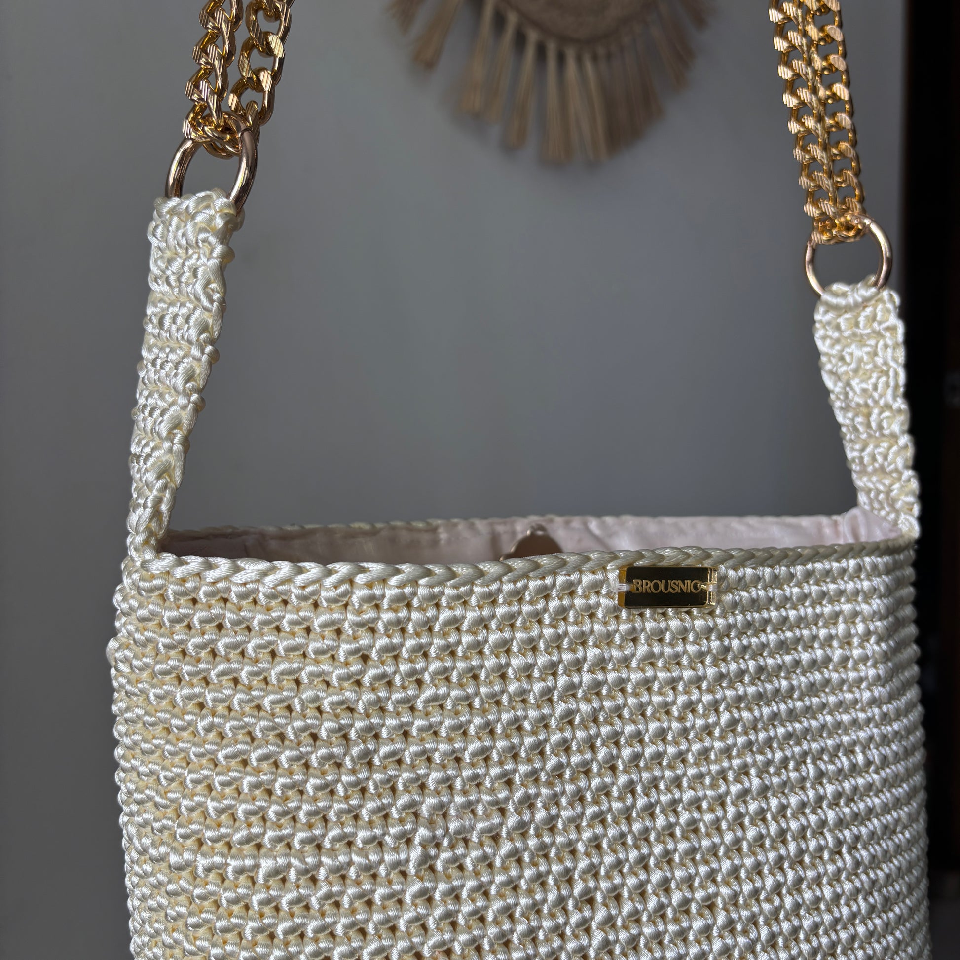 Una cartera hecha a mano con hilo de seda y una cadena de muy buena calidad en color dorado. Una pieza única que representa la fusión perfecta de tradición y modernidad.