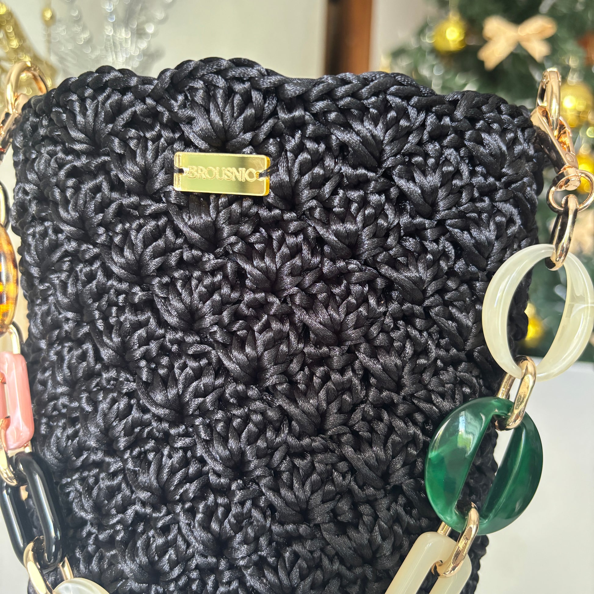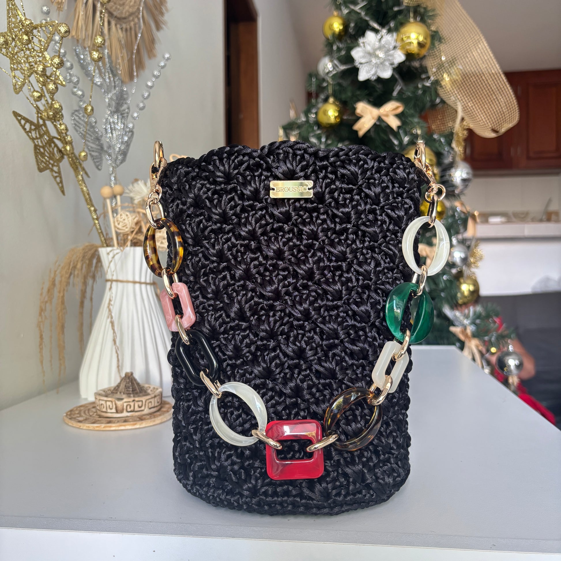 Una mochila hecha a mano con hilo de seda. Una pieza única que puedes utilizar 3 maneras diferentes, cuenta con una cadena dorada y una manigueta en diferentes colores.