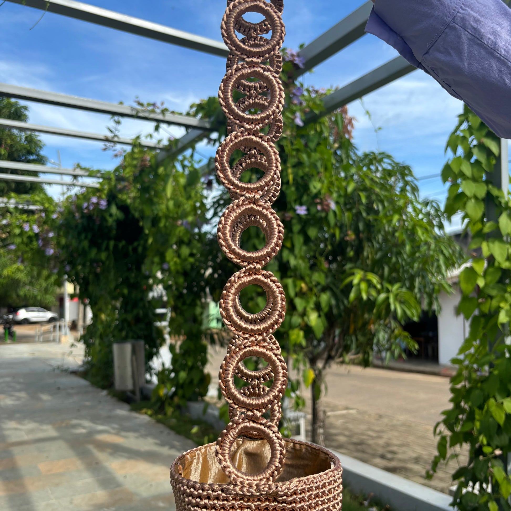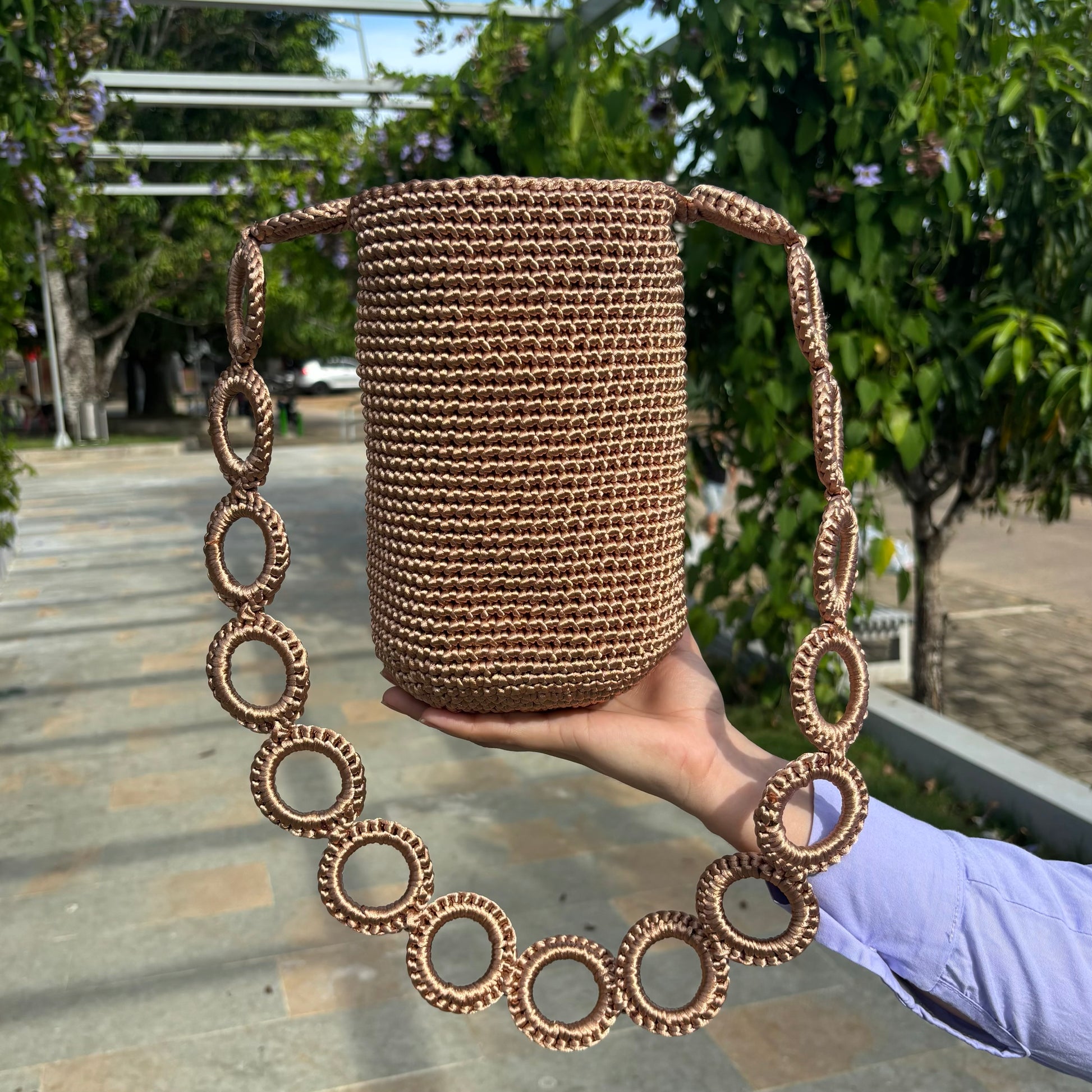 Una mochila hecha a mano con hilo de seda. Una pieza única que representa la fusión perfecta de tradición y modernidad.
